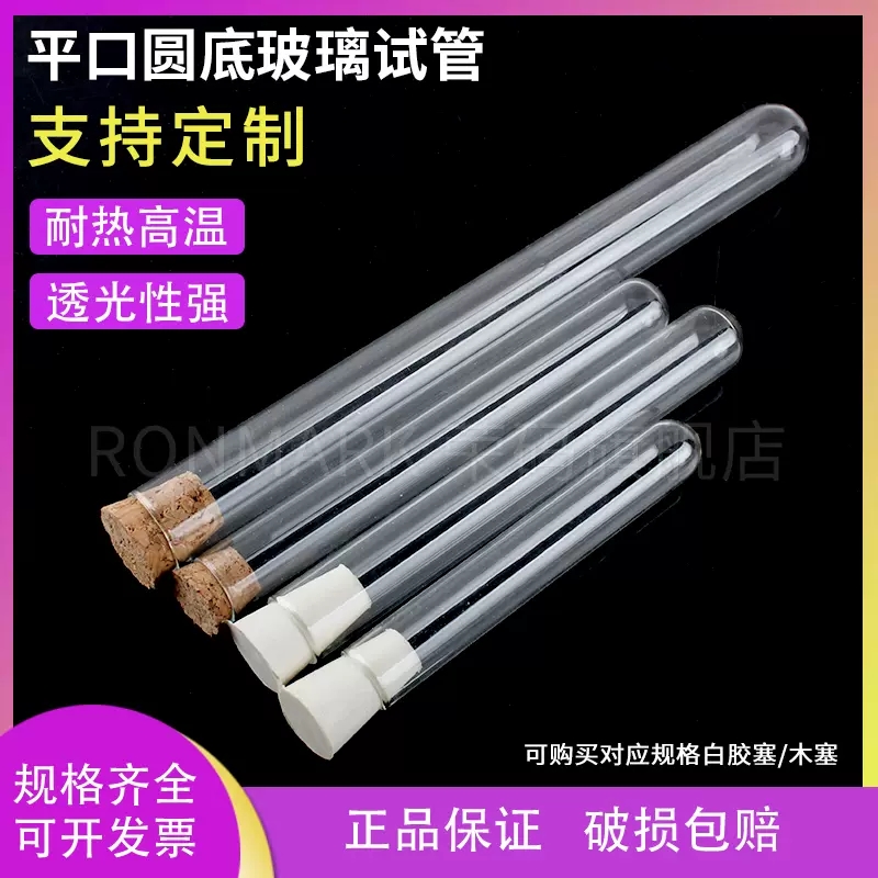 产品名称:平口圆底玻璃试管 产品材质:无铅玻璃 塞子:可购买相同规格白胶塞/木塞 特点:规格齐全,透光率强,做工精细,口部卷口圆润饱满。