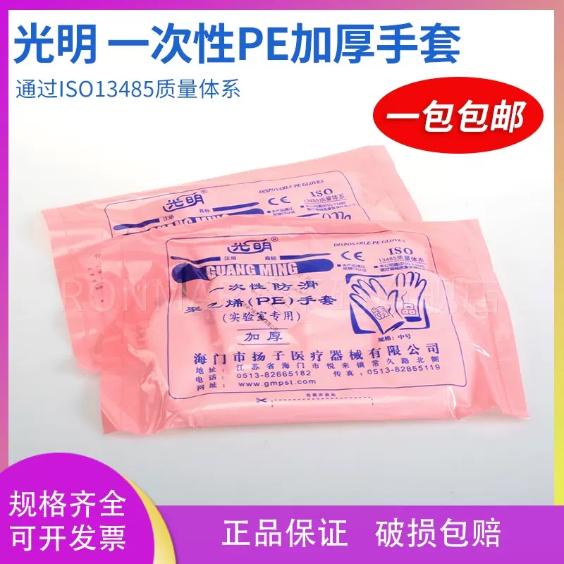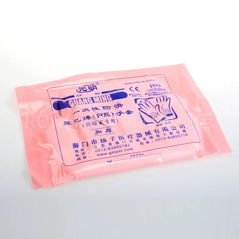 产品名称:光明一次性PE加厚手套 材质:聚乙烯 规格:中号 包装:75只左右/包,50包/箱 颜色:透明,表面磨砂 保质期:五年
